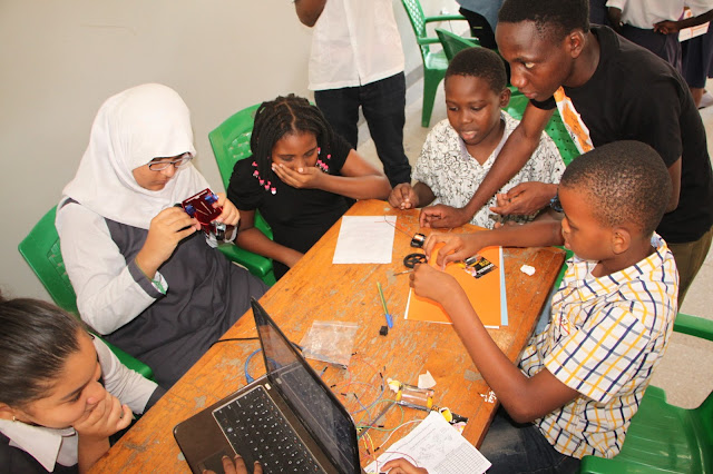 Wanafunzi wakipata maelekezo ya kutengeneza magari hayo kutoka kwa mtaalamu wa masomo ya sayansi, Gibson Kawago kutoka Chuo cha Teknolojia Dar es Salaam (DIT)